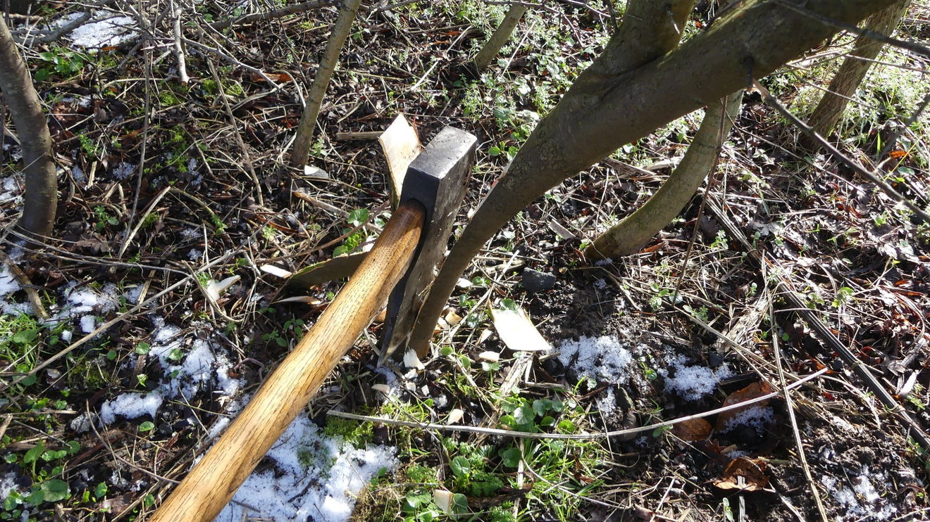 I use an axe, handbill, or chainsaw to split the stems, depending on their thickness, leaving part uncut so the bushes can be pulled over and are able to continue growing. Some have such dense canopies they cannot be successfully laid and these I cut off completely, coppicing them and new growth develops from the stumps.